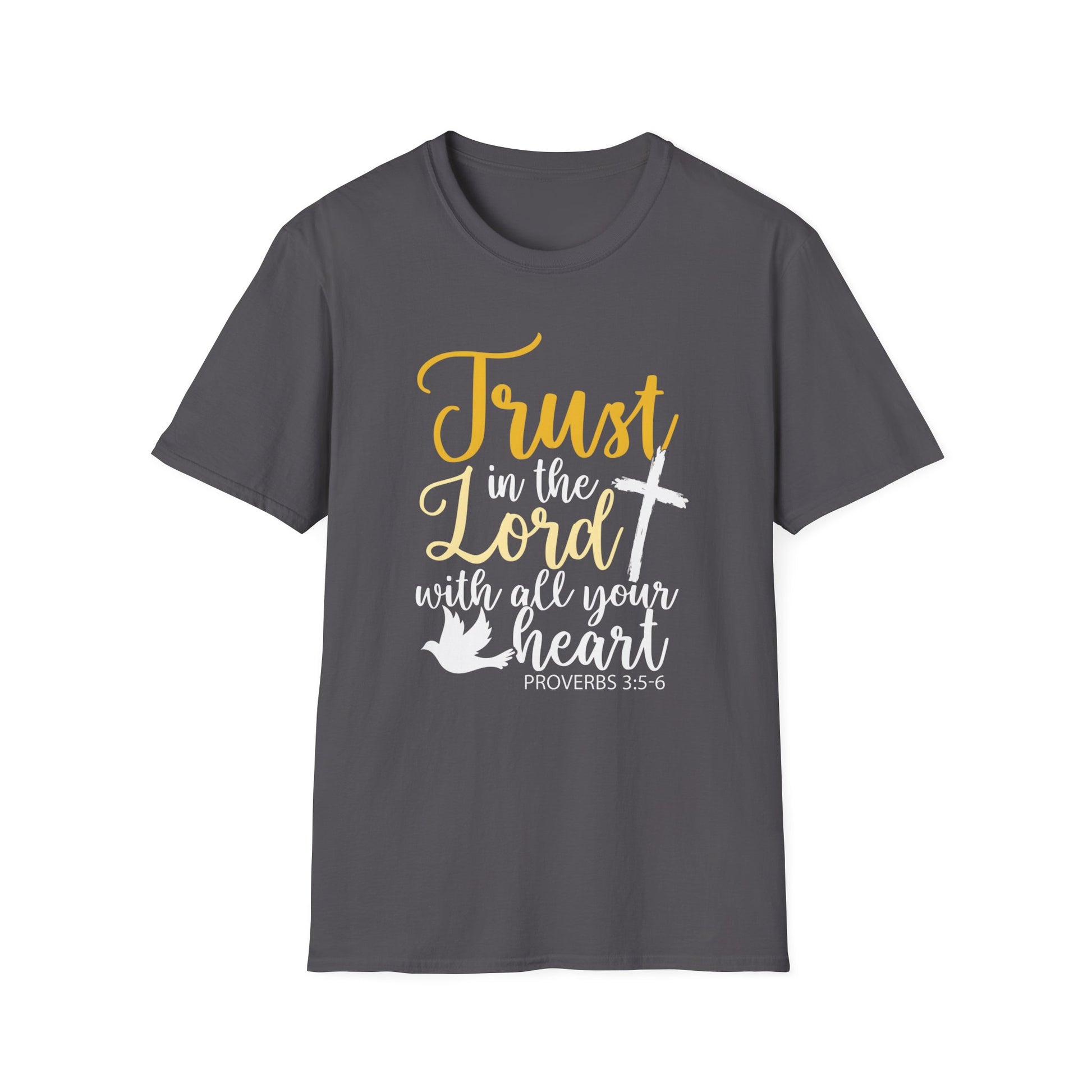 Our Trust in the Lord - Proverbs 3:5-6 T-Shirt is made from soft cotton with a relaxed fit and classic crew neckline. It’s a comfortable faith-inspired tee that reminds you to stay grounded in Proverbs 3:5–6 and trust God with all your heart.
